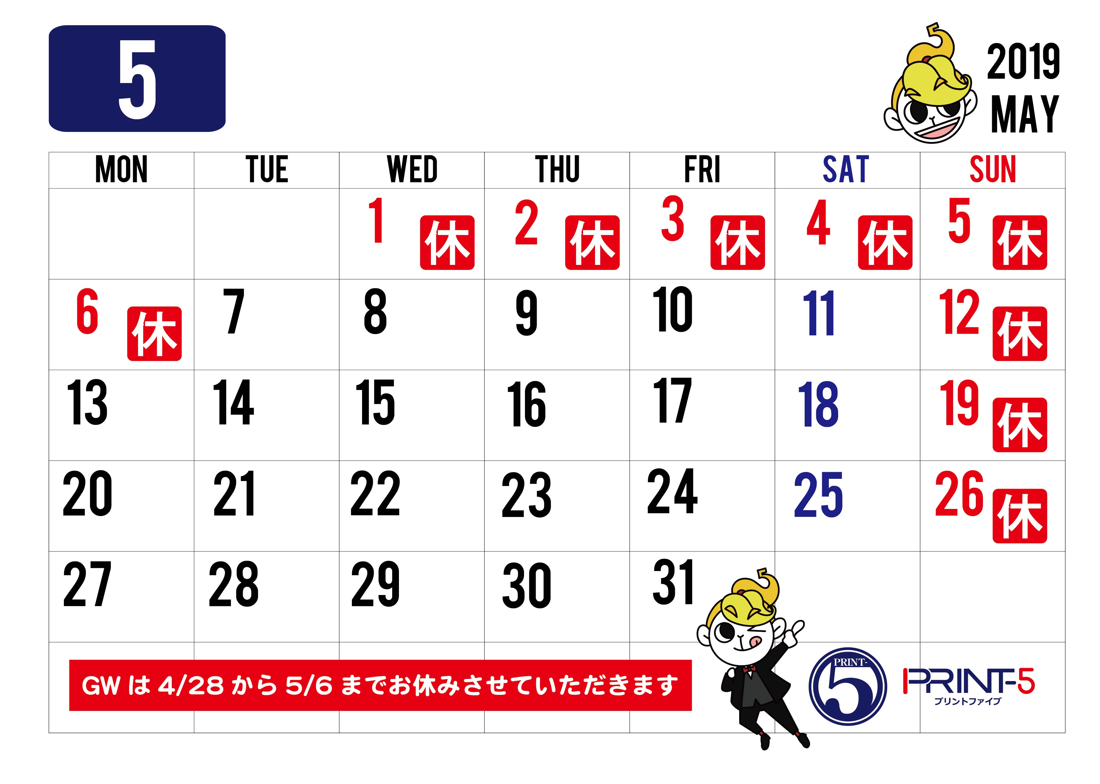 PRINT-5のGWは4/28(日)から5/6(月・祝)までです。